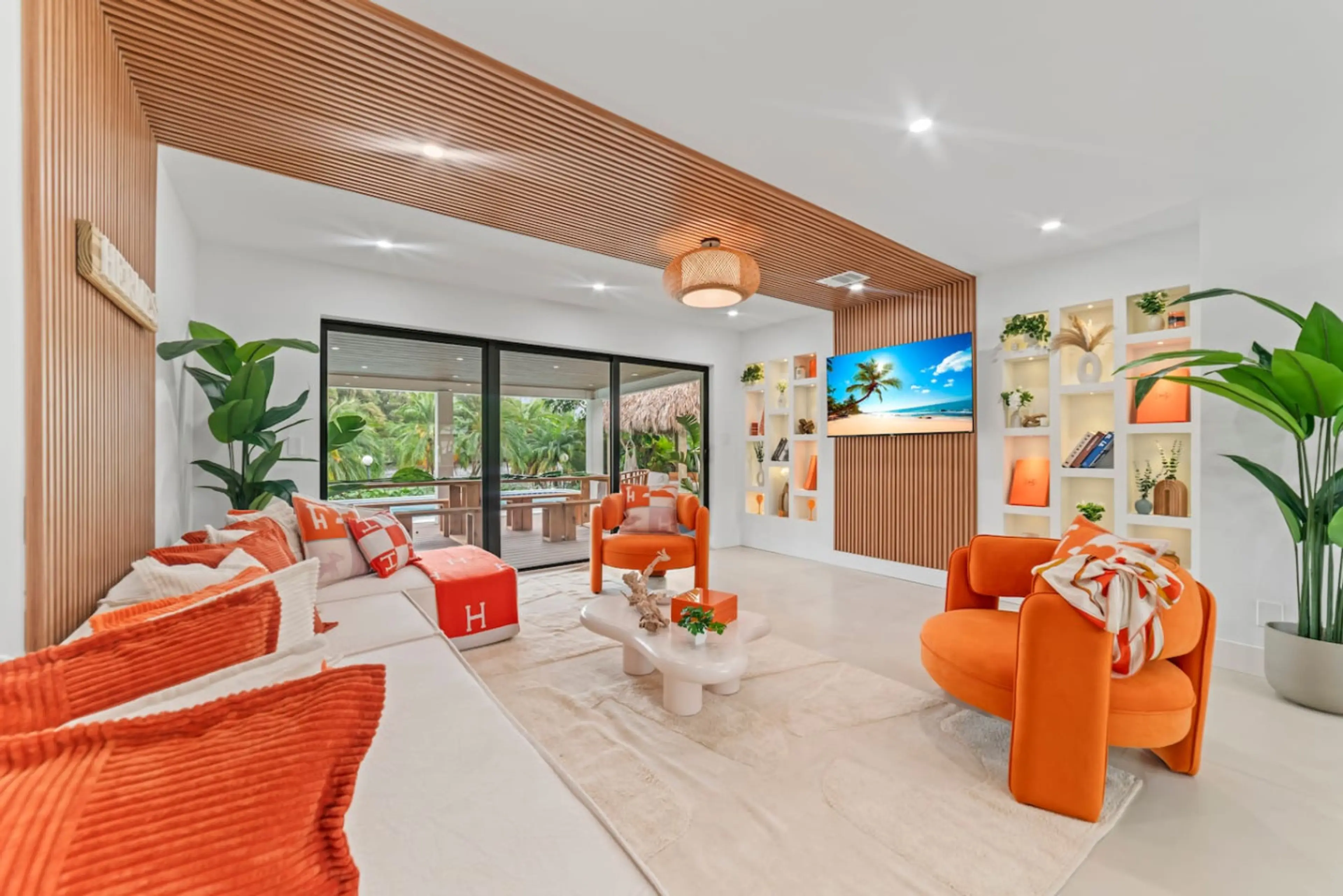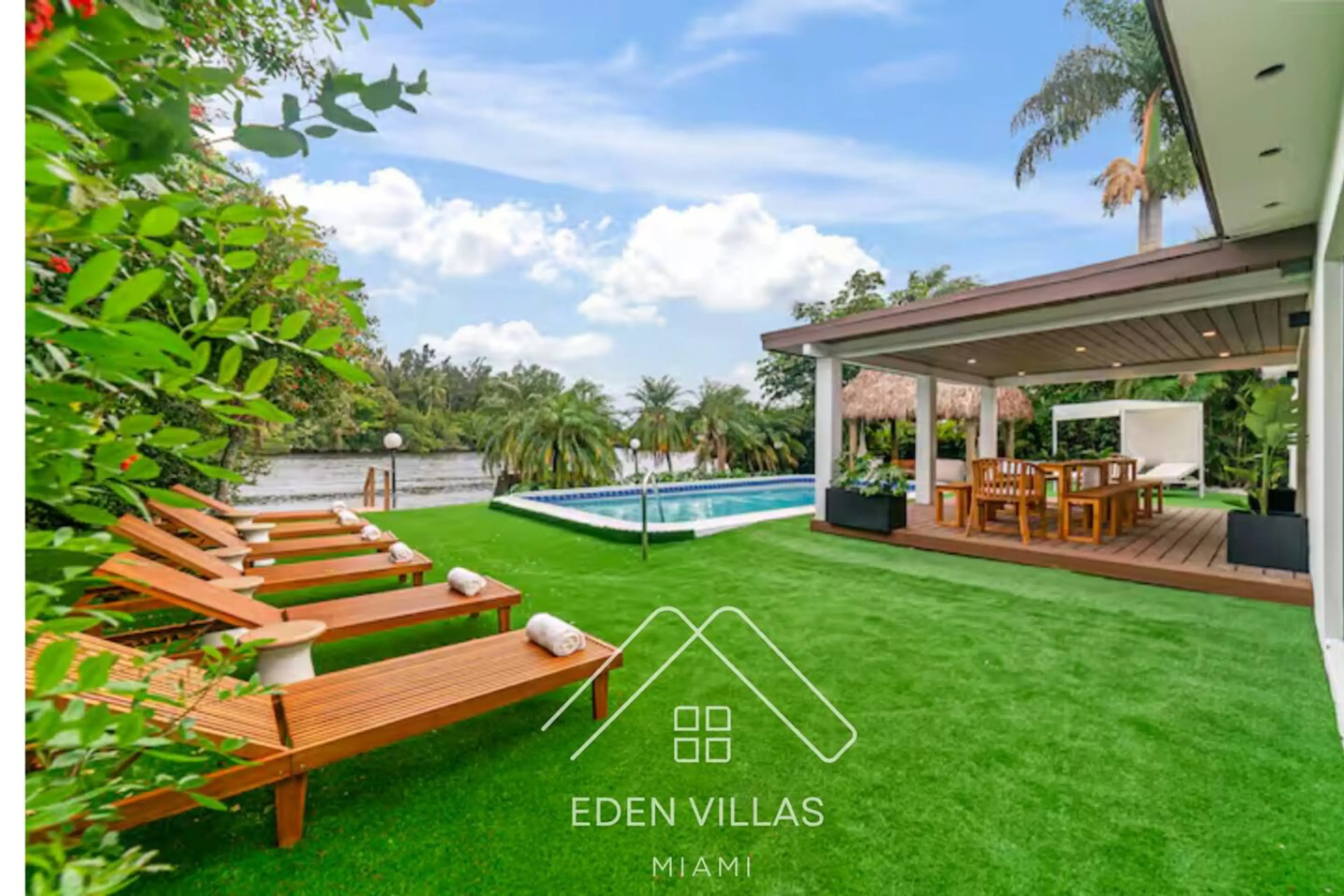 Eden Villas Waterfront with Hermès-Inspired decoration, tropical landscaping. Relax in this 100% private Florida retreat featuring a pool, lush greenery, and a tiki hut with hammocks and plush seating. Elegant Hermès-inspired décor adds a touch of luxury indoors and out. Enjoy sun loungers, modern...
